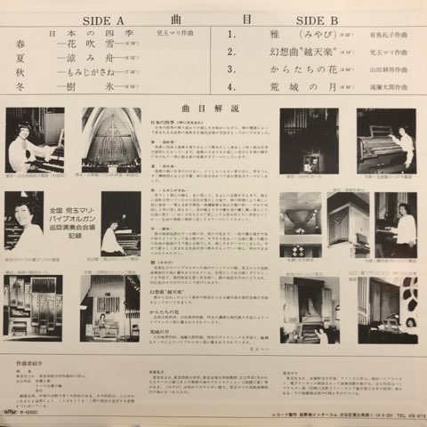 これはヤバいです!69年に電子オルガン作品『クリスマスの夢 宇宙電子オルガン』もリリースしている鍵盤奏者、児玉マリの78年自主製作作品。同年11月10日に行われたパイプオルガンによる東京聖マリア大聖堂での実況録音盤。1曲目に不穏な空気を感じつつ2曲目の始まり方に度肝を抜かれそのまま持って行かれるA面の4曲からなる自作曲「日本の四季」、雅楽を取り入れたB面の自作曲「幻想曲 越天楽」などアウトサイダー感すら漂うぶっ飛び具合!凄すぎ!