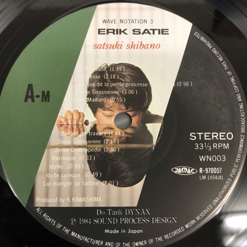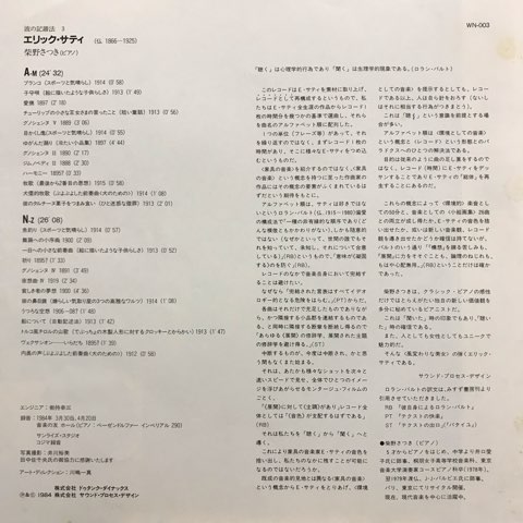 芦川聡が82年に設立したレーベル、サウンド・プロセスから84年にリリースされた、その芦川聡『Still Way』、吉村弘『Nine Post Cards』と同シリーズの〈Wave Notation〉第三弾となる柴野さつきによるErik Satie集。Satieの全作品からレコード一枚の時間分を選曲し曲名のアルファベット順に配列しSatie再構築したという、世に数多あるSatie作品集のなかでも一際コンセプチュアルな作品。「Gymnopedie No. 1」が入ってないところも最高です。