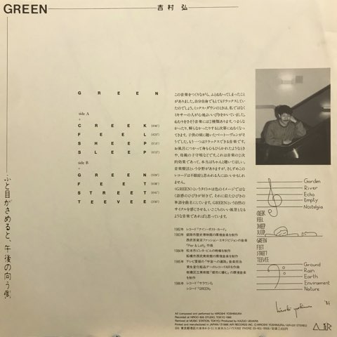 現在世界から再評価されている日本の環境音楽家/音響デザイナーの先駆者、吉村弘の86年作。この吉村弘ならではのシンセサイザーの音色・旋律はもはや魔法レベルの心地よさ!Greenというタイトルは色のイメージではなく語感の響きから来ているそうですが、それでも夏の終わりの田園風景とともに聴くと泣きそうなほどにハマります。
