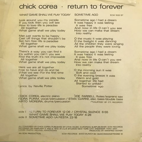 Chick Corea〜ECMだけでなくジャズを代表する説明不要の超有名盤。このまろやかでオーガニックな響きは今聴いても新鮮に響きます。Chee Shimizのディスクガイド「Obscure Sound 桃源郷的音盤640選」でも第1ページ目を飾ったマスターピース。音質抜群のドイツ完全オリジナル盤。