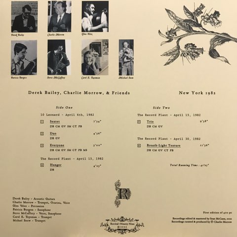 フリー・インプロヴィゼーションのパイオニア的ギタリストDerek Baileyと、John CageやFlxusとも関わりのある前衛アーティストCharlie Morrowが82年に行った未発表ライブを初音源化した2022年作。ほかにはSuso SaizとのグループMusica Esporadicaのメンバーでもある打楽器奏者Glen Velez、詩人Steve McCaffery、映像作家/即興演奏家Michael Snowなどが参加しておりBaileyのソロから7人によるインプロヴィゼーションを収録しています。Glen VelezのユニークなパーカッションやキレッキレのBaileyのギターなど全曲聴きどころ満載です。
