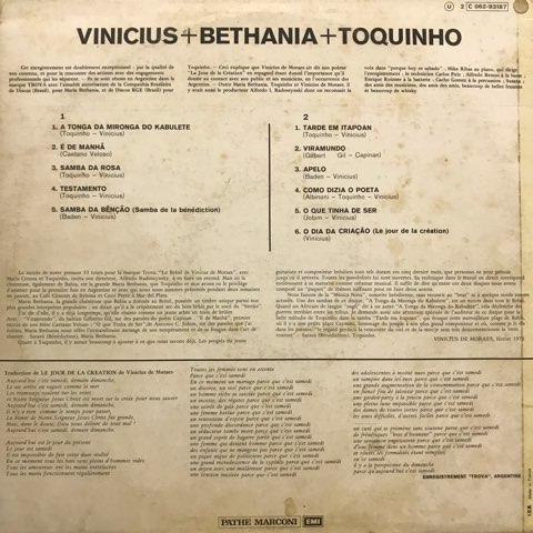 ボサノヴァの大作詞家Vinicius de Moraesがブラジルを代表するSSWのひとりでギタリストのToquinho、Caetano Verosoの妹でありシンガーMaria Bethaniaと共演した71年アルゼンチン録音盤。Toquinhoのギターも軽やかに響くリラックスなムードに満ちたボサノヴァ名作。