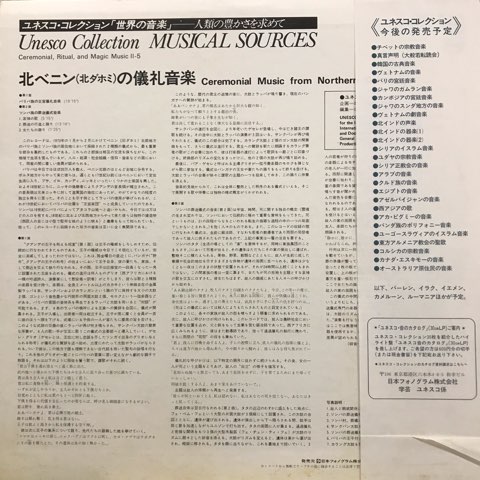 ナイジェリアの隣に位置する西アフリカ・ベナン北部地方に居住するバリバ族とソンバ族の儀礼音楽を現地録音したユネスコ・コレクション〈世界の音楽〉シリーズからの一枚。全長2m以上にもなるカカキという伸縮自在の金属製ラッパが強烈なバリバ族、こちらも大型の木製笛がユニークなソンバ族とどちらも非常に面白い演奏です。やはり大型ラッパにハズレなし!