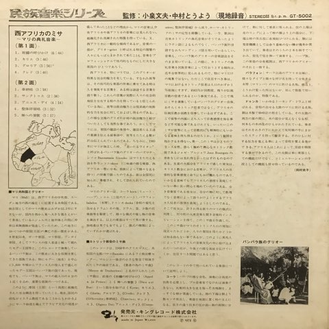 小泉文夫と中村とうようによる民族音楽シリーズでリリースされた、西アフリカの中央部に位置する共和国マリの教会で1968年に演奏されたミサの録音。マリの中でも社会的権力を持ったグリオーと呼ばれる階層の音楽家による、ハープのような音色のリュート型撥弦楽器コラ、バラフォン、トーキング・ドラムのドゥンカを使った、中央アフリカや南アフリカの野生の思考のような民族音楽とはまた違う、クールで洗練されたミニマル・ミュージックを聴かせてくれます。