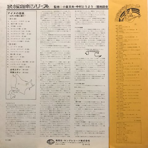 日本の先住民族であるアイヌの人々に受け継がれる伝統音楽を現地録音した1枚。巻き舌による強烈な「子守歌」、途中からひたすらミニマルになる合唱曲「イヨマンテの踊り」、口琴の演奏は世界中に数あれどこの倍音変化によるトリップ感は最高峰といってもいい「ムックリ」、狂った唸り声のような「タプカル」など、他では聴けない独自音楽の数々をずらり収録。小泉文夫・中村とうよう監修の民族音楽シリーズの中でも特に素晴らしい内容を誇る傑作です。