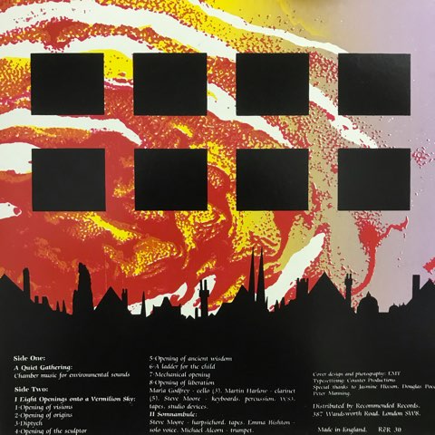スコットランドの前衛作曲家Steve Mooreの88年作。A面すべてを占める、環境音で構築したミュージックコンクレート「A Quiet Gathering」、B面のアンビエント/ノイズ/ミニマルの9曲からなる「Eight Openings Onto Vermilion Sky」を収めたエクスペリメンタル音響作品。