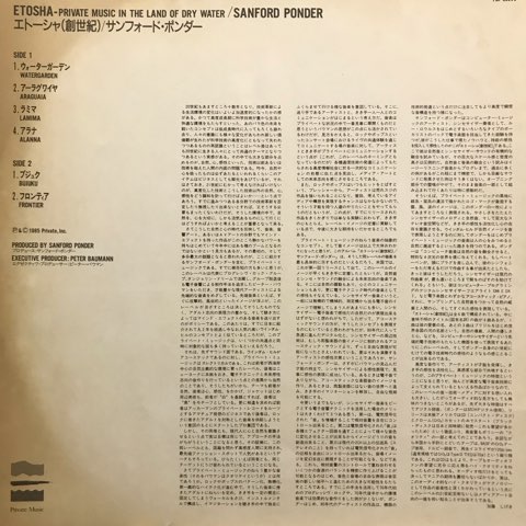 Chee Shimizuによる名ディスクガイド『obscure sound』掲載盤。Tangerine Dreamの初期メンバーPeter Baumannが設立したNYのニューエイジ・レーベル Private MusicからリリースされたアメリカのミュージシャンSanford Ponderの85年作。エスノ風ミニマリズムを基調にした極上アンビエント/ニューエイジ作品。全曲良いです。名作!