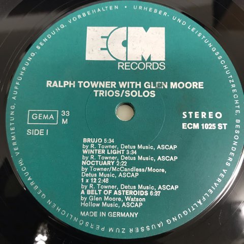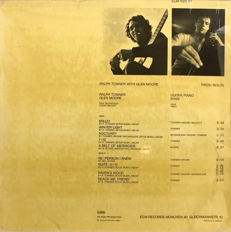 エスノ・ジャズ・ユニットOregonの中心人物でありECMを代表するギタリストRalph Townerの初リーダー作。タイトル通りトリオとデュオによる演奏を収録。共演者はOregonのメンバーであるGlen Moore、Collin Walcott、Paul McCandless。Collin Walcottのタブラが圧倒的な存在感を放つほぼOregonなエスノ・ジャズ「Brujo」、Bill Evans作の「Re: Person I Knew」など
