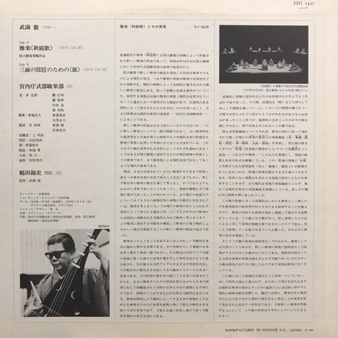 アヴァンギャルドからポップスまでジャンル関係なく幅広い音楽愛を持った日本が誇る現代音楽家、武満徹が国立劇場からの委嘱により73年に作曲した新作雅楽「秋庭歌」と、映画『怪談』や「エクリプス」「ノヴェンバー・ステップス」でも重要な役割を果たした琵琶のための作品「旅」を収録した一枚。両曲とも融通無碍なリズムの不規則性、独特の伸び縮みする間合いなど、西洋音楽にくらべ時間も空間の概念ももっと曖昧に捉える日本的な要素を昇華した傑作。