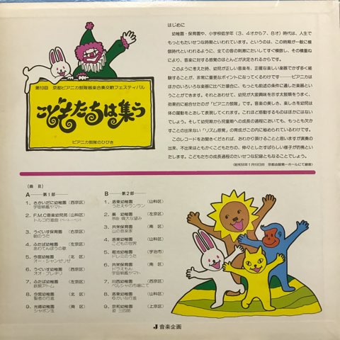 1981年1月19日、京都会館第1ホールにて行われた京都市の幼稚園児による演奏会「第10回 京都幼児ピアニカ鼓隊 器楽合奏交歓フェスティバル」の模様を収めたレコード。The Shaggs、Maher Shalal Hash Baz、The Portsmouth Sinfonia、49 Ameriacansなんかが好きな人にはたまらないピュアなズレやカオスが聴けます。歌も可愛くて最高!幼稚園レコードにハズレなし!