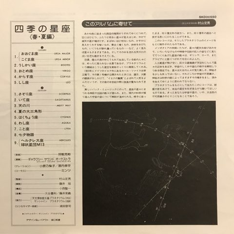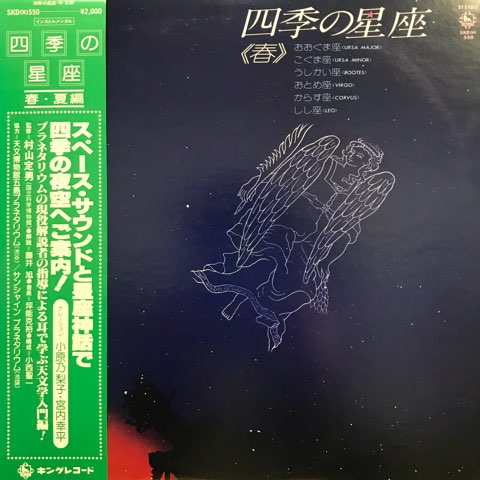 天文学者の村山定男が監修し、声優の小原乃梨子と宮内幸平がナレーターを担当した、詳細な音声解説による本格的な疑似プラネタリウム・レコード。なのですが、異形の実験音響盤『天地聲聞』を録音した事でも知られる現代音楽作曲家で現日本現代音楽協会会長の坪能克裕が音楽を、林立夫を中心に結成されたエスノ・アンビエント・ユニット、ARAGONのメンバーにもなる浦田啓司がシンセサイザーを担当しており、ナレーターのバックにトリッピーな電子音や無調の音楽が流れるという、宇宙を題材とするにふさわしいかなりぶっ飛んだ内容になっています。