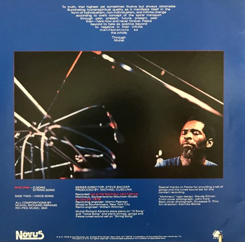 シカゴの実験ジャズ集団AACMの発足メンバーの一人にして初代会長Muhal Richard Abramsの78年ソロ作品。長尺の理知的なフリー・ジャズ・ピアノが聴ける「D Song」と「Voice Song」、そしてなんといってもピアノの内部奏法やゴング、シンバルを用いた音響作品「String Song」が激ヤバ!!