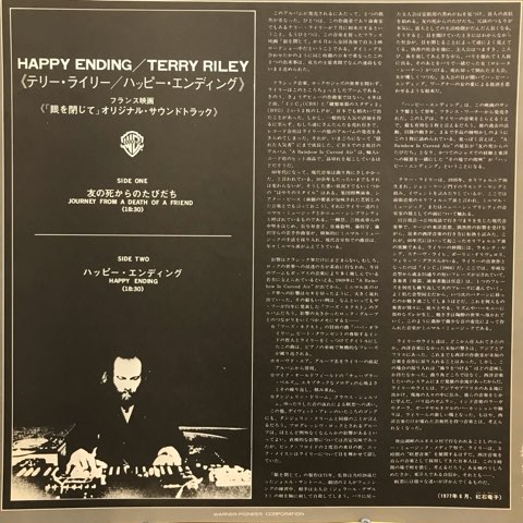 コロナ禍以降日本在住となった現代音楽/ミニマル・ミュージック史上最重要人物の一人Terry Rileyが音楽を担当した71年フランス映画『瞳を閉じて』のサウンド・トラック。Aに面電子オルガンとテープ・エコーによる「Journey From The Death Of A Friend」、B面に管楽器と電子オルガンとピアノによる「Happy Ending」を各面に1曲づつ収録。両面ともインナー・トリップできるミニマル名盤!
