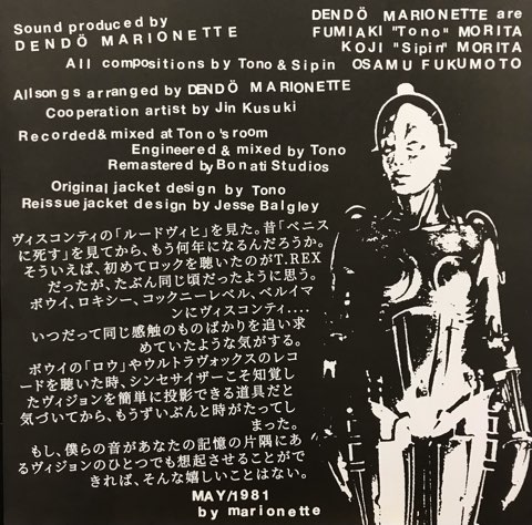 80年代初頭に大阪で活動していたカルト・シンセ・パンク・バンド電動マリオネットが81年に残した1stソノシートと2nd7インチ用に録音していた未発表音源4曲を追加した2017年リリースの公式編集盤。視聴はシンセが吹き荒れるパンク・ナンバー「Frozen・Edge」とダーク・アンビエントな「Consciousness」。