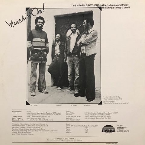 数々のスピリチュアル・ジャズ名盤を世に送り出してきた米レーベルStrata-Eastの中でも屈指の内容を誇るThe Heath Brothersの76年作。Percy Heathの極太ベース、Albert Heathのタイトなドラムス、そしてやはり最も印象的なStanley Cowellの宇宙的響きのカリンバが唯一無二の魅力を醸し出す「Smilin' Billy Suite Part 2」収録。これぞスピリチュアル・ジャズな「Maimoun」も名曲!