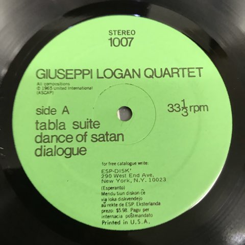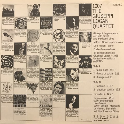 私的フェイバリット・フリー・ジャズ作品!フィラデルフィア出身のフリー・ジャズ・ミュージシャンで1960年代に活動した後70年代初頭に音楽シーンから姿を消し、30年以上にわたって消息不明でしたが2008年に再発見され2010年には新作もリリースしたリード奏者Giuseppi Loganが64年にESPに吹き込んだデビュー作。1曲目いきなり異星のお祭りに来たかのような「Tabla Suite」、ミニマルなフレーズがひたすら続く「Dance Of Satan」のしょっぱな2曲で一気に持っていかれます。この人のフニャフニャ・サックス最高です!