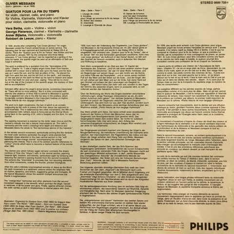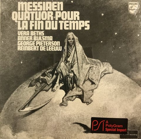 フランス現代音楽の巨匠Olivier Messiaenが第二次世界大戦でドイツ軍の捕虜となっていた時に収容所で作曲したという代表作のひとつ「世の終わりのための四重奏曲」。ゆったりとした演奏でErik Satieのアンビエント性を最大限に引き出した作品でも知られるピアニストReinbert de Leeuwが参加した1977年録音80年リリースのオランダ・フィリップス盤。視聴はそのde Leeuwのピアノが印象的な退廃的ムード漂う「イエスの永遠性への賛歌」「イエスの不滅性への賛歌」、ユニークなクラリネット独奏の「鳥たちの深淵」から。