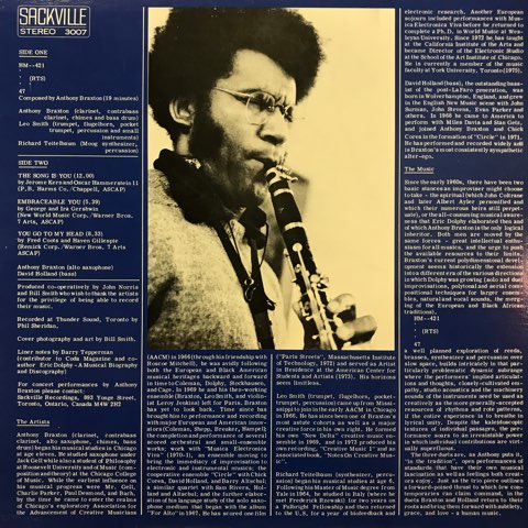 シカゴのフリー・ジャズ集団AACMにも所属していた奇才サックス奏者でBattlesのTyondai Braxtonの父でもあるAnthony Braxtonが、イタリアの前衛音楽集団MEV( Musica Elettronica Viva )の創設メンバーでもあるアメリカ人電子音楽家/シンセサイザー奏者Richard Teitelbaum、ECMに残した数々の名作で知られるベーシストDave Holland、同じくAACM出身のインプロヴァイザーLeo Smithとトリオ&デュオ編成で録音した74年作。作曲と即興を統合させたコレクティブ・インプロゼーションによる、電子音、サックス、トランペット、パーカッションが交錯しBraxton独自の音響世界を展開していくA面いっぱいに収録された「HM 421 (RTS) 47」が白眉。