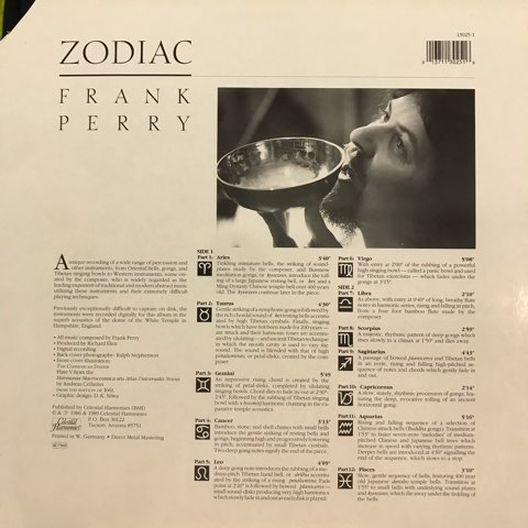 作曲家、演奏家だけでなく占星術師の顔も持つイギリスのパーカッショニストFrank Perryの89年作。チベタン・ベル、シンギング・ボウル、シンバルなどの仏教系金物楽器を用いて強烈な倍音が渦巻く鬼ディープでメディテーティヴな音響世界を構築したドローン/アンビエント作品。