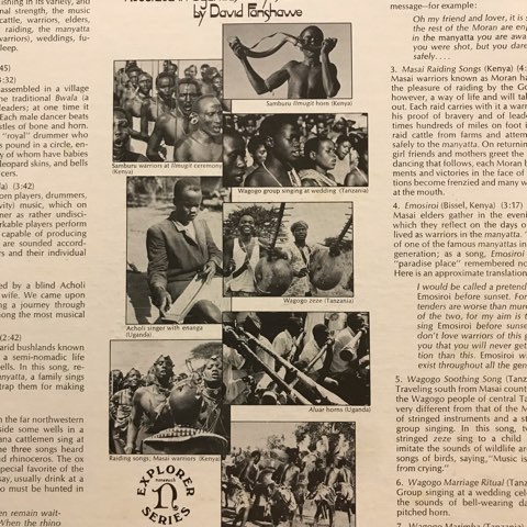 ワールドミュージックに熱烈な関心を持つイギリスの探検家で作曲家David Fanshaweがウガンダ、ケニヤ、タンザニアに居住するマサイ族、ワゴゴ族などの祭礼や日常の音楽を現地録音したNonesichの民族音楽専門シリーズExplorer Seriesからの一枚。強烈な太鼓や不協和なホーンのハーモニー、ミニマル合唱、ムビラと歌と打楽器によるトリッピーな演奏など激ヤバ独自音楽の数々を収録した民族音楽傑作!