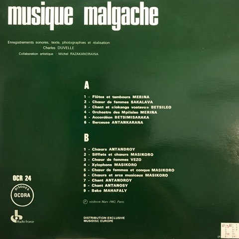 アフリカ南東部沖に浮かぶ巨大な島国マダガスカルの民族音楽をその筋では随一のフランス名門レーベルOcoraが63年に現地録音した一枚。様々な部族の音楽を収録していますが、中でも農家/牛・羊飼いのマシコロによる竹笛やザイロフォンのミニマル・ミュージック、メロディカ風楽器と奇妙なヴォーカルが聴けるアンタンカラナ族の子守唄など独自色が強くオススメです。