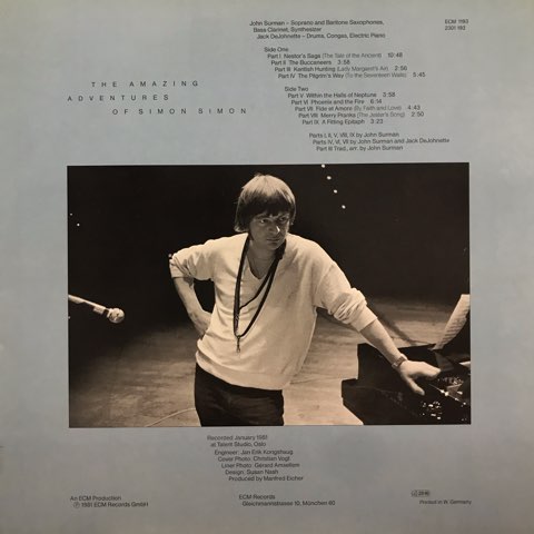 英フリージャズ/ジャズロックの様々な名盤でも知られるサックス奏者John SurmanがJack DejohnetterとのデュオでECMからリリースした81年作。ソプラノ、バリトン、バスクラ、そしてシンセサイザーまで駆使し多重録音によって創り上げた前作「「UPON REFLECTION」」をさらに発展させた作品。