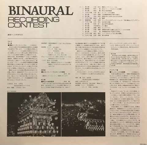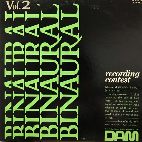 DAM(第一家庭電器株式会社)企画制作による、リアル音響バイノーラルで録音された音源を一般の人から募集して作られたレコード「バイノーラル録音コンテスト」。定番のフィールドレコーディングものも多数ありますが、宅禄の演奏に面白いものが多いです。なかでも一人五役で多重録音した「たった一人の五重奏」、常盤炭坑節を素材にリズムボックスも用いてミニマルに宅禄したナレーション入りの「常盤炭坑節の主題によるバイノーラルの音楽」、フォーキーな演奏にヤバイシンセやフィールドレコーディングも入ったアシッドな「イメージサウンド 白と黒の情景」なんかの個人の宇宙が溢れ出た感じはアマチュアならでは!最高です。ほかにもバイノーラルを有効に使いストーリー仕立てに展開していくタイトルだけで興味を惹かれる「悪夢」「夜の訪問者」なども。