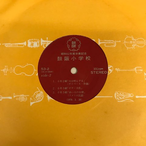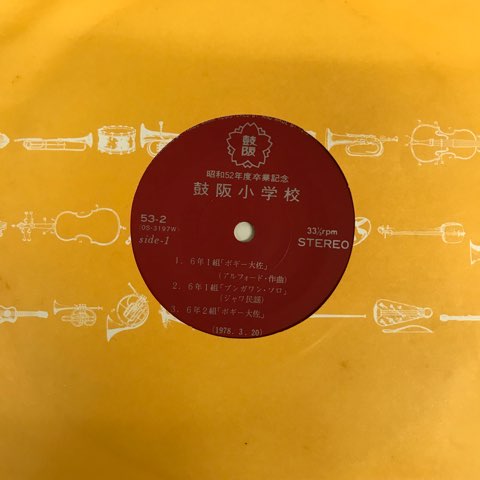 当店から約1kmほどの距離にある150年の歴史を持つ奈良市立鼓阪小学校の卒業記念のための77年7インチ・シングル・レコード。当時奈良に本社・工場があったTeichikuに製造を委託した自主盤。小学生モノレコードはよくあるコンクール系は上手すぎて個人的にはあまり惹かれませんがこちらは6年生による学校での演奏を収めており、幼稚園モノほどの破壊力はなくとも好事家にはたまらない絶妙によれたアンサンブルが聴けます。6曲収録。