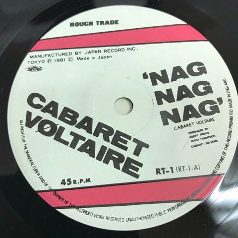 UKポスト・パンク/インダストリアル最重要バンドのひとつCabaret Voltaireの79年2ndシングルを、ラフトレードと提携した徳間ジャパンから81年にリリースされた日本盤7インチ。A面「Nag Nag Nag」はリズム・ボックスとベースを軸にノイズが吹き荒れる代表曲のひとつ。エクスペリメンタルなB面「Is That Me (Finding Someone At The Door Again?)」も◎。