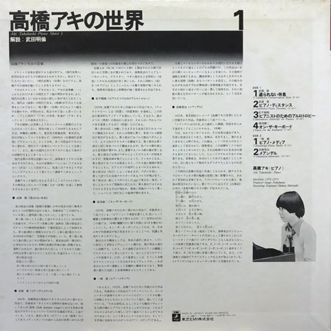 武満徹、湯浅譲二、一柳慧、高橋悠治、John Cage、Anton Webern、Luciano Berio、Iannis Xenakis、Olivier Messiaen、Karlheinz Stockhausen、John Cageなどの作品を取り上げた高橋アキの3枚組デビュー盤から武満徹、湯浅譲二、松平頼暁、一柳慧、高橋悠治の曲を抜粋してリリースされたアルバム。この作品のために実兄の高橋悠治よって「迷宮」という意味を込められて作曲された「メアンデル」は作曲者の意図通り途中で自分が一体何を聴いているのか分からなくなってくる不思議な曲です。一柳慧による「ピアノ・メディア」もハード・ミニマルなカッコよさ。