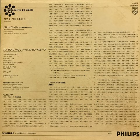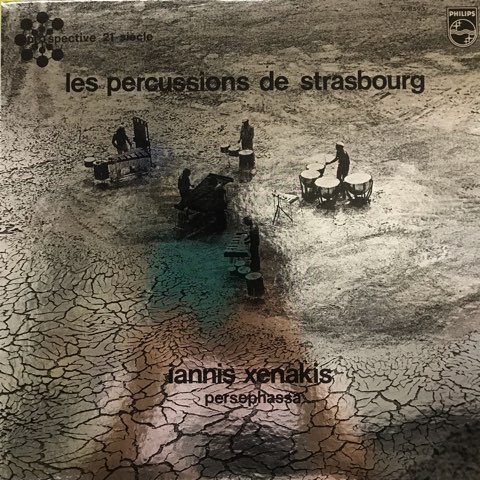 20世紀現代音楽が生んだ最高の前衛作曲家の一人Iannis Xenakisが69年に作曲した6人の打楽器奏者のための曲「Persephassa」をXenakis監修のもとフランスのパーカッション・グループLes Percussions de Strasbourgが演奏した71年作。音の余韻を感じさせる奥行きのある定位にもこだわった録音・演奏によって、スピーカーの前で目を閉じて爆音で聴いていると模様のようなものが浮かんでくるXenakisならではの唯一無二の音響体験ができる打楽器音楽傑作。銀色ジャケも秀逸!