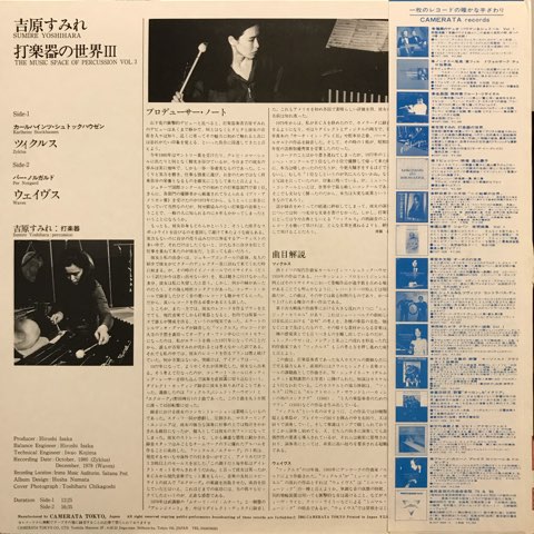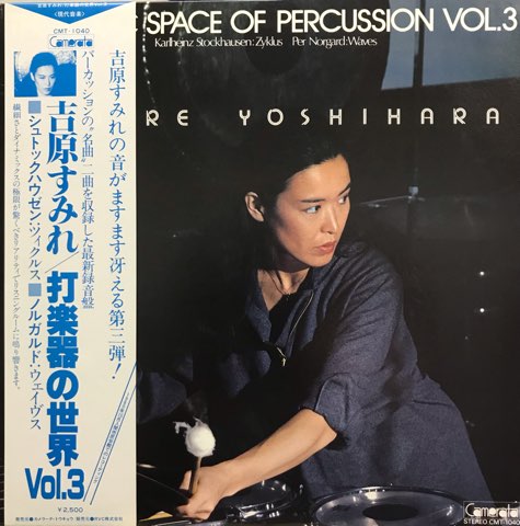 A面に現代音楽を代表するドイツの作曲家、シュトックハウゼンの「Zyklus」を、B面にデンマークの現代音楽作曲家、ノルガルドの「Waves」を収録した、世界で活躍する名打楽器奏者、吉原すみれの81年作。20種類以上の様々なテクスチャーの打楽器が素晴らしい音質でカラフルに鳴り響くシュトックハウゼンの「Zyklus」、言葉では言い表せないほどに残響音が凄いことになる中盤や、打楽器がスピーカーの中で飛び跳ねる後半など新しい音響体験ができるノルガルドの「Waves」と両面最高です。これは是非スピーカーを通して爆音で!