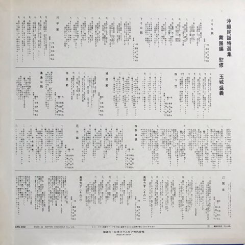 喜納昌永、嘉手苅林昌、知名定男、吉里和美、稲嶺八重子による沖縄の伝統芸能、琉球舞踏のための民謡を収録した沖縄ゴモン・レコードからのコンピレーション。視聴は知名定男によるサウダージ溢れる哀愁の「花笠節」、喜納昌永と嘉手苅林昌によるミニマル琉球「仲里節」。