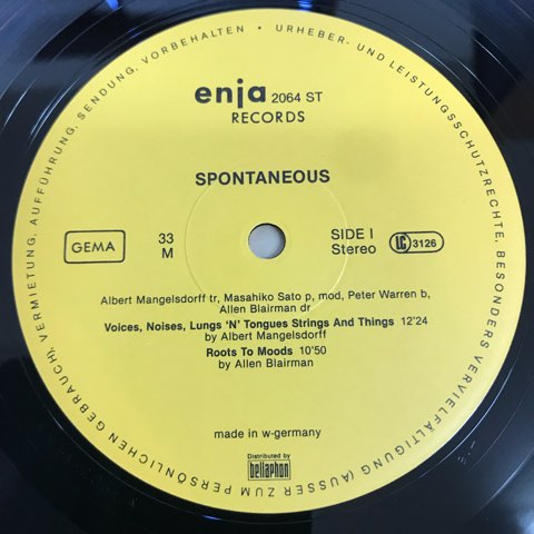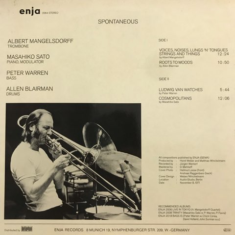 ドイツの奇才ジャズ・トロンボーン奏者Albert Mangelsdorffが佐藤允彦、Allen Blairman、Peter Warrenと録音したEnjaからの72年作。フリージャズ作品ですが、佐藤允彦が1曲の中でアコースティック・ピアノとモジュラーシンセを使い分けており、そのモジュラーシンセの演奏部分がAlbert Mangelsdorffのユニークなトロンボーンと相まって異次元空間を創り出しています。全編これで行って欲しかった、、、。