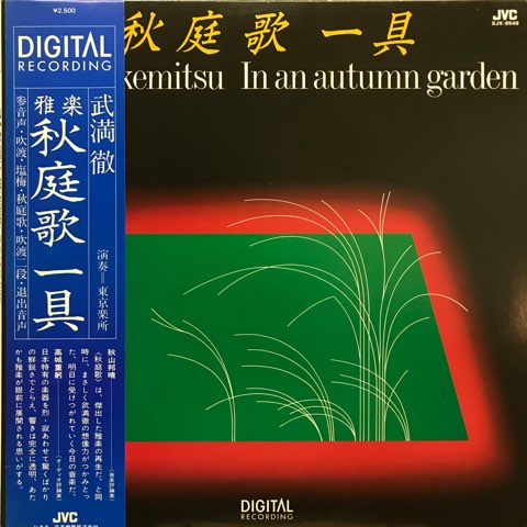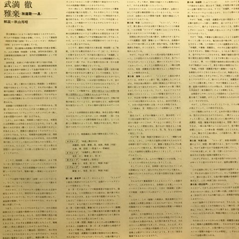 日本が誇る現代音楽家、武満徹が国立劇場からの委嘱により73年に作曲した新作雅楽「秋庭歌一具」。笙の極彩色の倍音や融通無碍なリズムの不規則性、独特の伸び縮みする間合いなどを生かし古典雅楽が内包しているドローン/アンビエント/サイケデリック性をさらに引き出した大傑作!過去を現在に昇華し古典の聴き方すら変えさせる武満の才能が遺憾なく発揮された素晴らしい作品です。