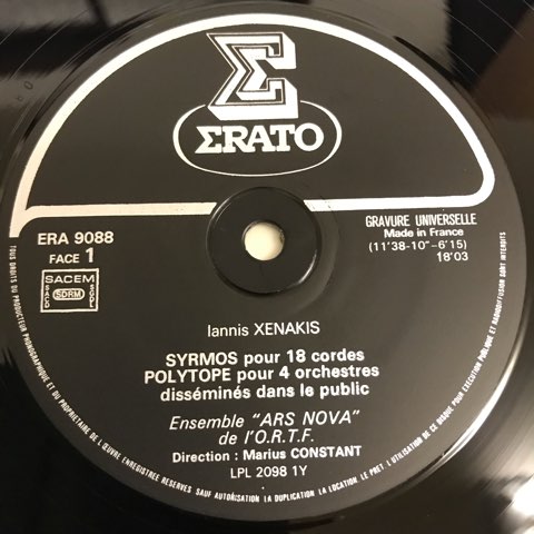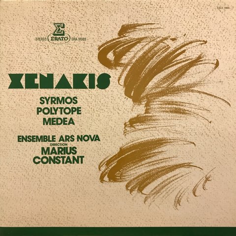 フランスが誇る現代音楽作曲家で建築家でもあるIannis Xenakisのオリジナルは71年に仏Eratoからリリースされた、18弦楽のための「Syrmos 」、管弦楽曲「Polytope」、声楽と管弦楽のための「Medea」を収録した一枚。特にA面に収録された59年作曲の「Syrmos 」と67年カナダ・モントリール万博でのXenakisが担当した彫刻・ライトショー・音楽によるインスタレーションのために作曲された「Polytope」は、とても生楽器だけとは思えない電子的な響きすら感じさせる凄まじいオーケストレーションによって幾何学模様の音世界に放り込まれるような、Xenakisでしかありえない音響体験ができる傑作です。強烈!
