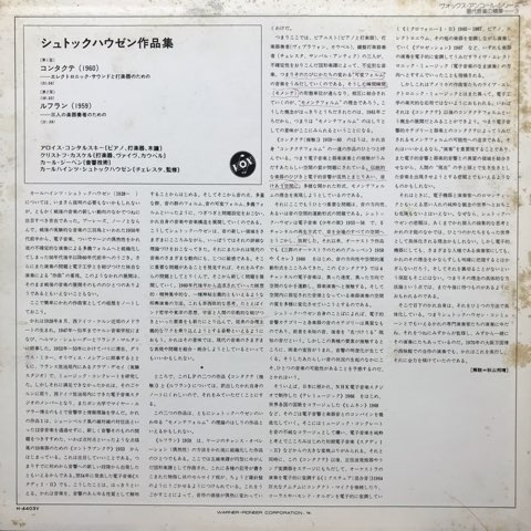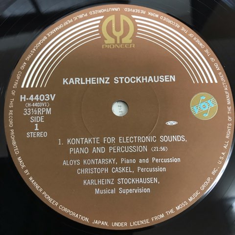 現代音楽最重要人物、ドイツのKarlheinz Stockhausenが1963年に制作した代表曲のひとつ電子音楽作品「Kontakte」。こちらはStockhausen自身が監修しチェレスタでも参加した69年VOX盤。プリペアド・ピアノと打楽器と電子音が交錯するエレクトロニクス/ミュージック・コンクレート古典!