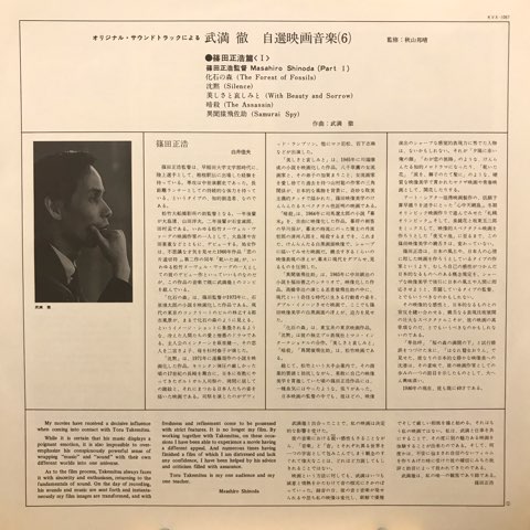 前衛だけにとどまらずポップスなどにも素晴らしい名曲を残している日本が誇る音楽家、武満徹が手掛けた映画音楽を10枚にまとめたシリーズ「オリジナル・サウンドトラックによる武満徹自選映画音楽」の第6弾。今作は武満とコンビを組んで以来数多くの作品を産み出してきた篠田正浩篇。サーランギ、ダルシマー、タブラなどの民族楽器や電気ヴァイオリン、シンセサイザーによる完全異世界な「化石の森」、ハープの使い方がヤバすぎの「沈黙」、プリペアド・ピアノのほかアフリカの楽器も使った「美しさと哀しみと」、後の代表曲となる「ノヴェンバー・ステップス」の原型「暗殺」など、武満の音響的魅力が詰まったこのシリーズの中でもトップクラスに入る大傑作!