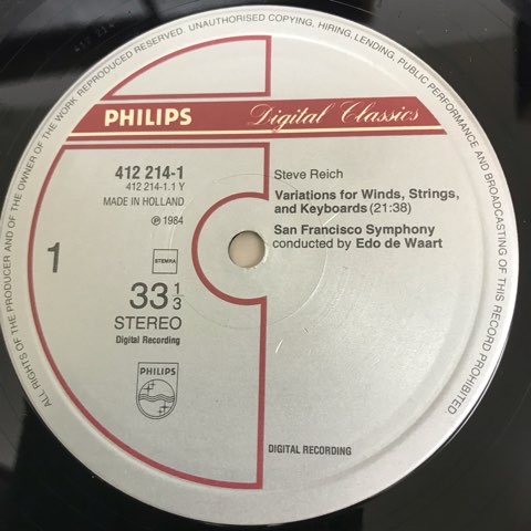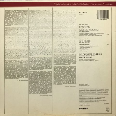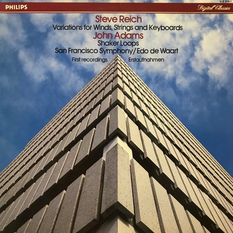 A面にミニマル・ミュージックを代表するアメリカの作曲家Steve Reichがサンフランシスコ交響楽団からの委嘱により制作した「Variations For Winds, Strings And Keyboards」を、B面にECMからもリリースしているミニマル第2世代〜ポスト・ミニマルの作曲家John Adamsの「Shaker Loops」を収録した84年作。「Octet」「Music For A Large Ensemble」の少し後に作曲された、管、弦、オルガンのフレーズがリフレインし高揚感を伴って変化していくReichの「Variations For Winds, Strings And Keyboards」は知名度的にはECMの諸作に及びませんが内容はそれらに匹敵する最高傑作のひとつに挙げたい珠玉の名曲。J.Adams「Shaker Loops」は弦楽オーケストラが揺らぎ、たゆたい、律動していく、ダイナミックな変化も取り入れたポスト・ミニマル的作品。