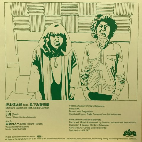 坂本慎太郎がゑでぃまぁこんのゑでゐ鼓雨磨をゲストに迎えてリリースした2019年7インチ・シングル・レコード。予言的な歌詞を書くことで知られる坂本慎太郎による「小舟」を始めて聴いて恐怖に慄いた2019年から5年たち、小舟がどんどん離れていってる2024年にもさらに有効に響く名曲!歌詞とバッチリハマるスローで音数の少ないスッカスカのアレンジも流石です!B面は作詞を担当したCornelius「未来の人へ」のカバー。