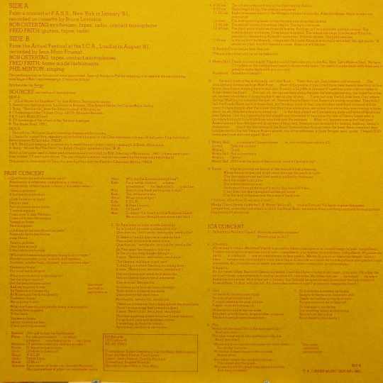 Henry Cowの前衛ギタリストFred FrithとサウンドパフォーマーBob Ostertag、前衛ヴォイス・インプロヴァイザーPhil Mintonによる82年作。A面にFred FrithとBob Ostertagによるギターやシンセ、テープのほか特に効果的なラジオも使用したインプロを、B面にFred Frithは自作楽器、Bob Ostertagのテープ、エレクトロニクス、Phil Mintonのキテレツ・ヴォイスによるインプロを収録。両面とも非常に面白いです。