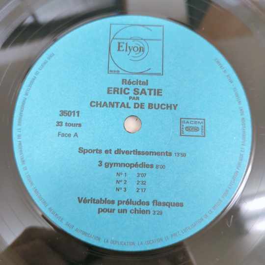 フランスが生んだ稀代の変人作曲家Erik Satieの楽曲をフランスのクラシック・ピアニストChantal De Buchyが取り上げた80年代リリースのアルバム。「3つのジムノペディ」、「6つのグノシエンヌ」、「スポーツと気晴らし」など代表曲を収録した、Sateiのひねくれたところとメランコリックなところの両面楽しめる一枚。Chantal De Buchyの澄んだ音色のピアノも◎。