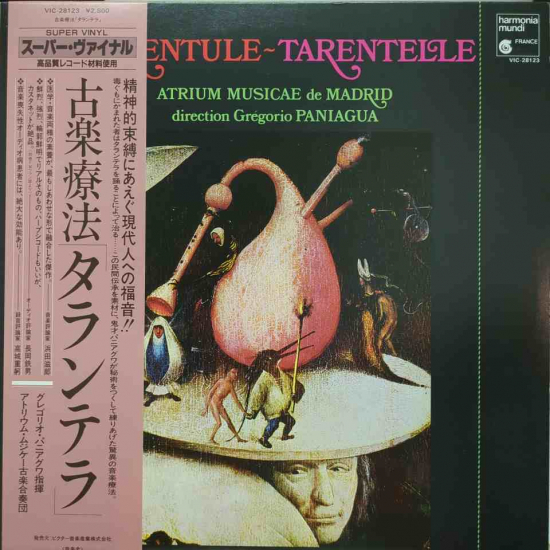 スペインの古楽研究家・古楽演奏家であり、現在再評価著しい80〜90年代のスペイン・ニューエイジ・シーンの重要人物、Luis Paniaguaの兄弟でもあり、そのLuisも参加している古楽アンサンブル楽団「アトリウム・ムジケー古楽合奏団」を率いるスペイン・コンテンポラリー・シーンの親玉Gregorio Paniaguaによる80年作。古くから伝わるという、毒グモ「タランテゥラ」の唯一の解毒手法である踊りの舞曲「タランテラ」をテーマにしたという、本気なのかユーモアなのかよくわからない人を食ったような感じがいかにもPaniaguaらしい作品で、音の方も相変わらずの自作古楽器に口琴やカスタネット、さらに鳥の鳴き声も入った怪盤です。ジャケはシュルレアリスムのルーツの一つでもある、中世ルネサンス期のオランダの画家ヒエロニムス・ボス(ボッシュ)の「快楽の園」から。