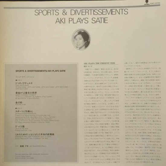 デビュー・アルバムにして武満徹、湯浅譲二、一柳慧、高橋悠治、John Cage、Anton Webern、Luciano Berio、Iannis Xenakis、Olivier Messiaen、Karlheinz Stockhausen、John Cageなどの作品を取り上げた3枚組大作をリリースしている日本を代表する現代音楽ピアニスト、高橋アキによるErik Satie集。誰からも愛される代表曲「ジムノペディ」は入っていませんが、ミニマルな「最後から2番目の思想」、タイトルも実にSatieらしい「スポーツと気晴らし」「犬のためのぶよぶよした本当の前奏曲」、軽快で陽気な「びっくり箱」など収録。特に晩年作の透明感溢れる名曲「5つのノクチュルヌ」は高橋アキのその濁りのない澄み渡った音色がジャストフィットした素晴らしい演奏。ジムノペディ以外のSatieも最高です。