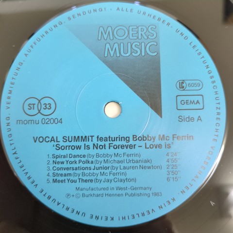 Lauren Newton、Urszula Dudziak、Jeanne Lee、Jay Clayton、Bobby McFerrinからなるヴォイス・ユニットVocal SummitがドイツのMoers Musicからリリースした83年作。Steve Reichやピグミーのポリフォニーを想起させるミニマルなフレーズから共演者も笑ってしまうくらいキテレツな展開になる「Stream」、ヴォイス・インプロヴィゼーション「New York Polka」、ECM作品でお馴染みの鍵盤奏者Rainer BruninghausやベーシストBarre phillipsなどのミュージシャンをバックに軽快なスキャットを聴かせてくれる「Sorrow Is Not Forever Love Is」などなど、ヴォーカルの可能性を拡張しようとした意欲作。