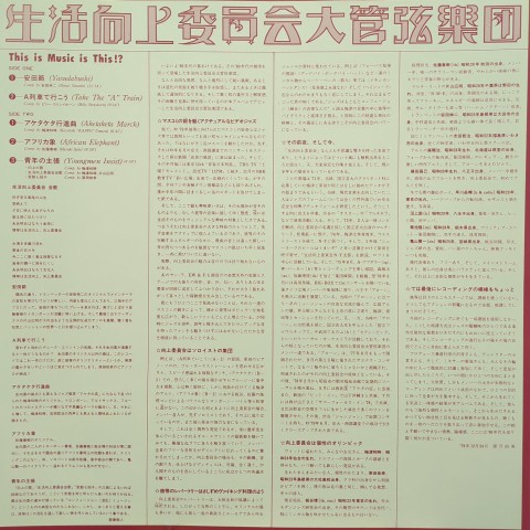 梅津和時、原田依幸が中心となり早川岳晴、板谷博、篠田昌己、片山広明など錚々たるメンバーが参加した日本が誇るフリージャズ集団、生活向上委員会大管弦楽団の79年ファースト・アルバム。原田依幸のぶっちぎりに素晴らしいイントロのソロ・ピアノからカオスな中盤になるDuke Ellington「A列車で行こう」はエリントン特有のヘンなハーモニーや猥雑でフリーキーな一面を拡大・強調したようなアレンジで個人的に物凄〜く共感・納得のできる演奏。内ジャケのSun Ra Arkestra〜P-Funkばりの衣装も最高です。