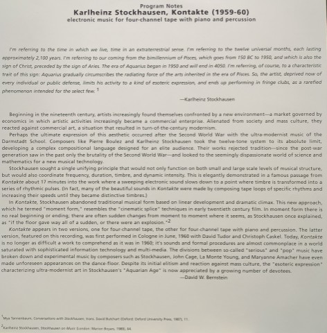 現代音楽最重要人物、ドイツのKarlheinz Stockhausenが1963年に制作した代表曲のひとつ電子音楽作品「Kontakte」。こちらはJohn CageやHarry Parch、Steve Reichらとも関わりのある米現代音楽作曲家James Tenneyによる78年録音97年リリース作。プリペアド・ピアノと打楽器と電子音が交錯するエレクトロニクス/ミュージック・コンクレート古典!