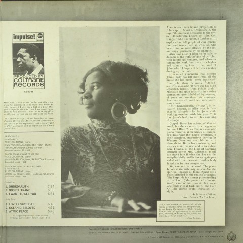 John Coltaraneの妻でFlying Lotusの叔母でもある、近年再評価著しいジャズ・ハーピストAlice ColtraneがJohn Coltaraneの死の翌年にリリースした68年初リーダー・アルバム。Jimmy GarrisonとRashied Aliとのトリオ編成で1曲でPharoah Sandersが参加。天上で鳴っているようなハープによる霊性ジャズ「Lovely Sky Boat」、Aliceのピアノも素晴らしい「Gospel Trane」ほか。