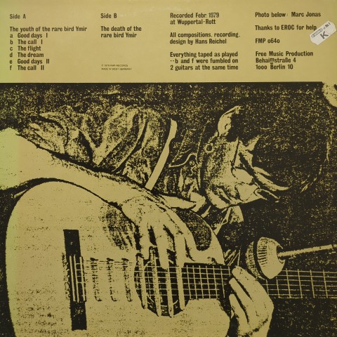 現在では内橋和久の演奏でも知られる、人の声色のような音色をした小型擦弦楽器ダクソフォンの発明者Hans Reichelドイツのフリー名門FMPからリリースした79根作。今作では自作変形アコースティック・ギターを用いて時折鳥の鳴き声や電話の音も入ったフリー・インプロヴィゼーションを展開しています。カワイイ鳥が特殊ギターにコラージュされたジャケットも◎。