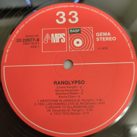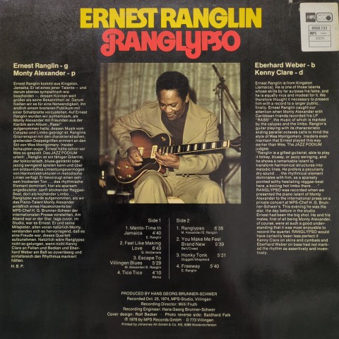 1950年代から活動しスカやレゲエの誕生にも関わったジャマイカのギタリストErnest RanglinがドイツMPSからリリースした76年作。バックに同郷のピアニストMonty Alexander、ドイツの異能ベーシストEberhard Weber、ドラマーKenny Clareが参加。Ernest Ranglinの甘い音色のギターとMonty Alexanderのまろやかなエレピに蕩ける極上メロウ「Feel Like Making Love」カバー収録。